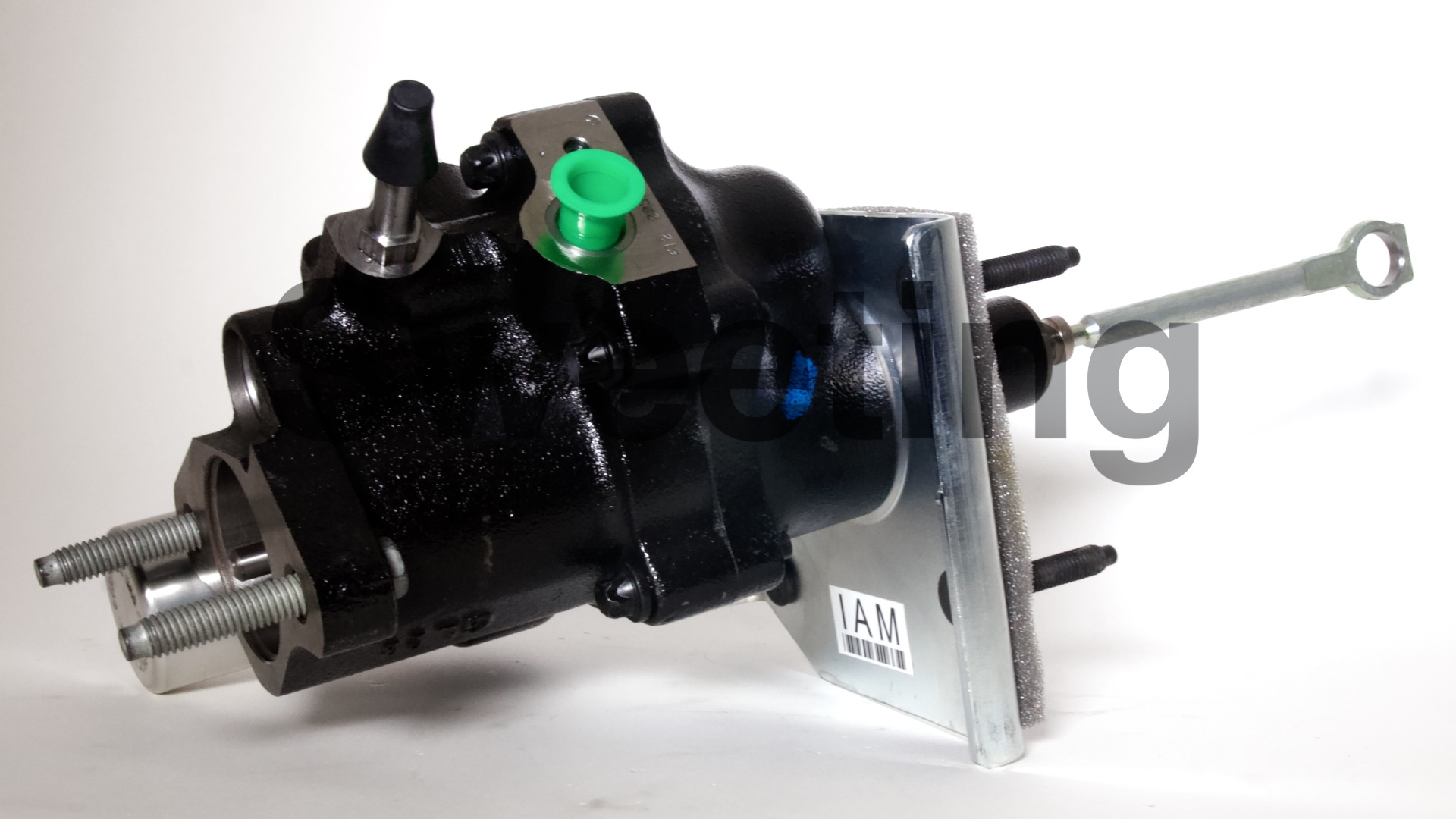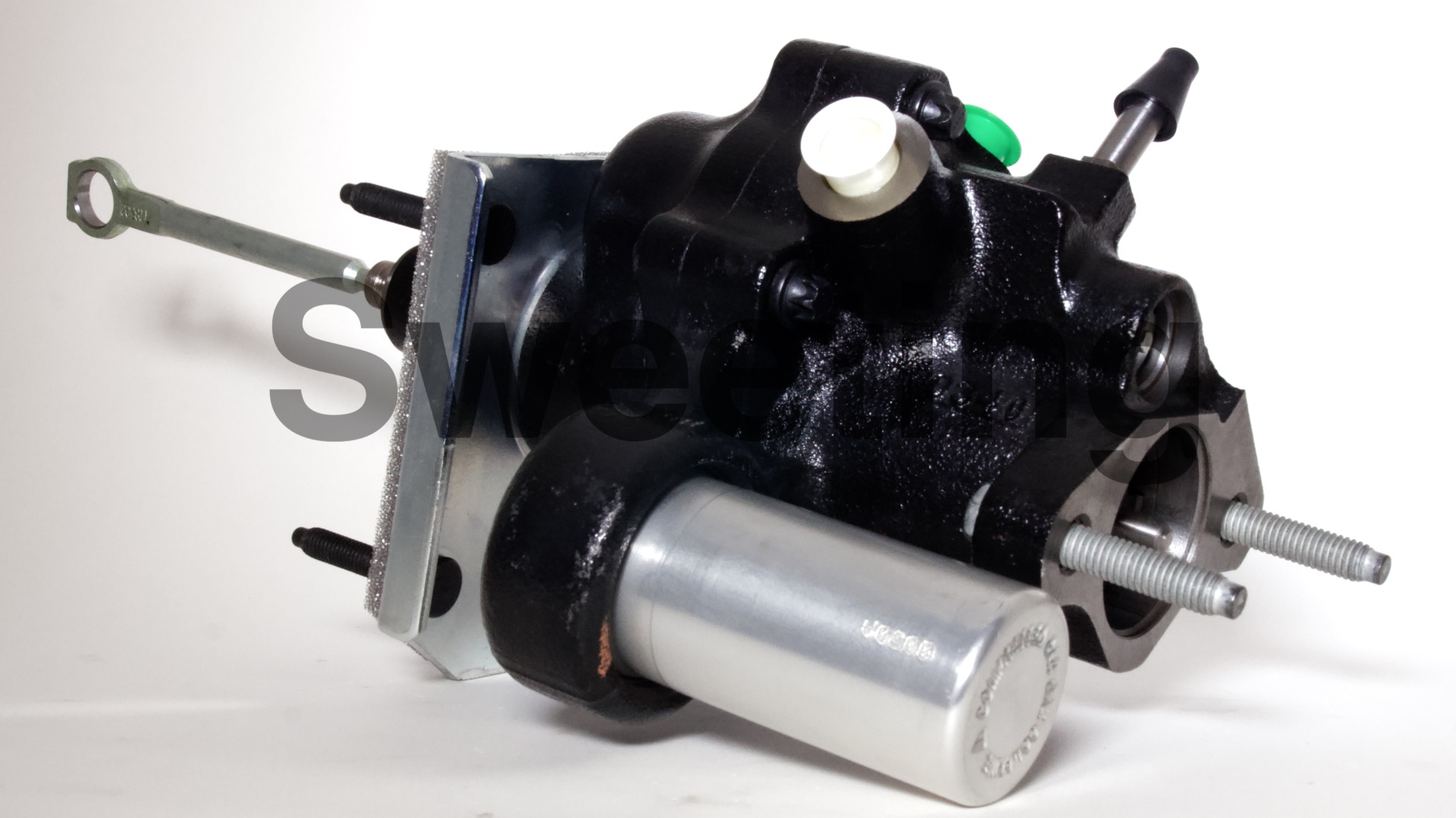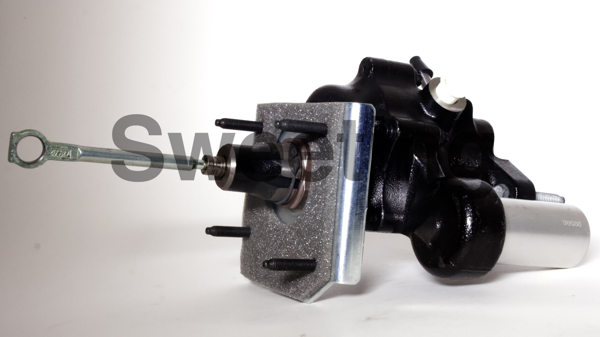 The Hydro-Boost is smaller in diameter than vacuum boosters, being about the dimensions of an iron master cylinder, it mates to the firewall/brake pedal and the master cylinder the same way a vacuum booster does, and it fits anywhere a vacuum booster will, as well as many place a vacuum booster won't. The aluminum canister on the side is the accumulator, which stores pressure in case your engine dies to provide you with some braking and steering assist to help you come to a safe stop.