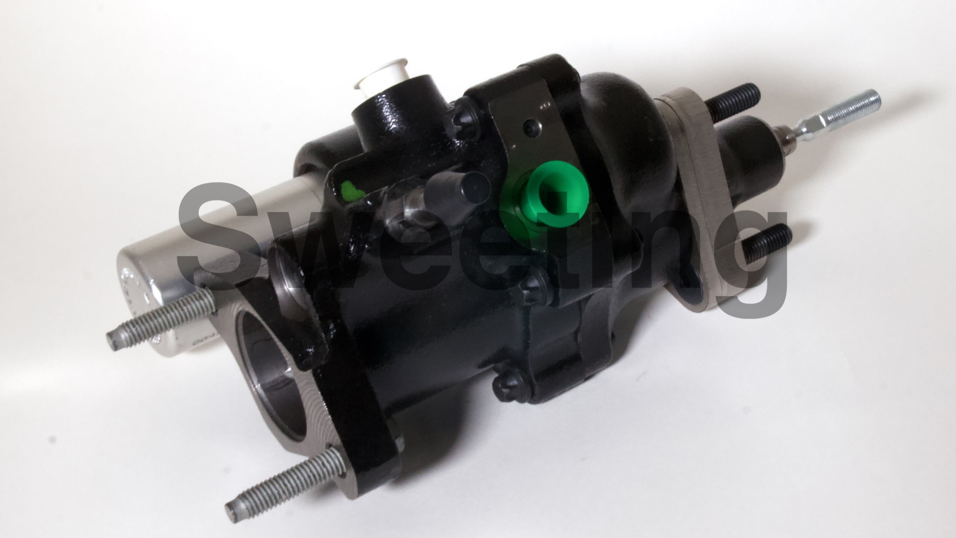 The Hydro-Boost is smaller in diameter than vacuum boosters, being about the dimensions of an iron master cylinder, it mates to the firewall/brake pedal and the master cylinder the same way a vacuum booster does, and it fits anywhere a vacuum booster will, as well as many place a vacuum booster won't. The aluminum canister on the side is the accumulator, which stores pressure in case your engine dies to provide you with some braking and steering assist to help you come to a safe stop.